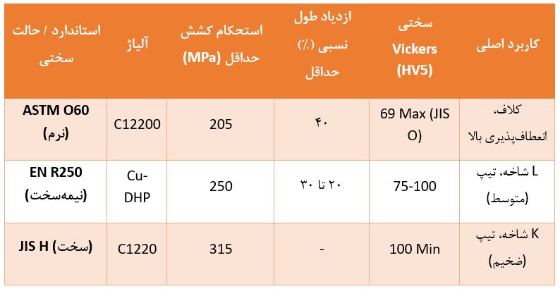 مشخصات مکانیکی کلیدی لولههای مسی بابک (آلیاژ DHP) بر اساس حالت فیزیکی