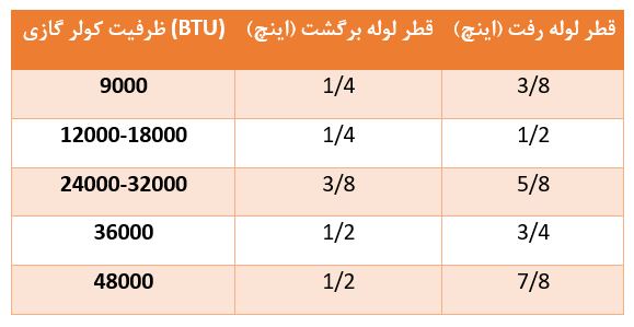 انتخاب قطر لوله نیز باید بر اساس ظرفیت برودتی کولر گازی (BTU) و برای دو خط رفت و برگشت (مایع و گاز) انجام شود.
