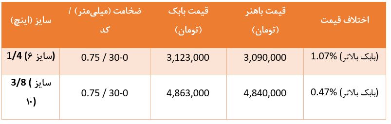 همانطور که مشاهده میشود، لولههای مسی بابک در این مقایسه دارای قیمت جزئی بالاتری نسبت به محصولات مشابه باهنر هستند، اما این اختلاف بسیار ناچیز است (کمتر از ۱.۱ درصد).