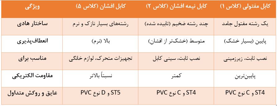 کابل افشان (کلاس ۵): نرمترین نوع است که برای کاربردهای متحرک و اتصالات انعطافپذیر طراحی شده است.