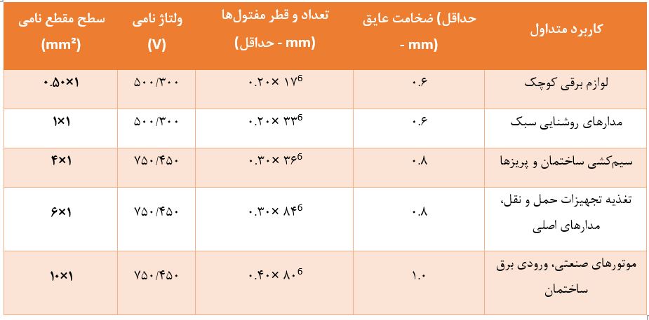 - تعداد رشتهها و سطح مقطع (مثلاً ۴×۶).