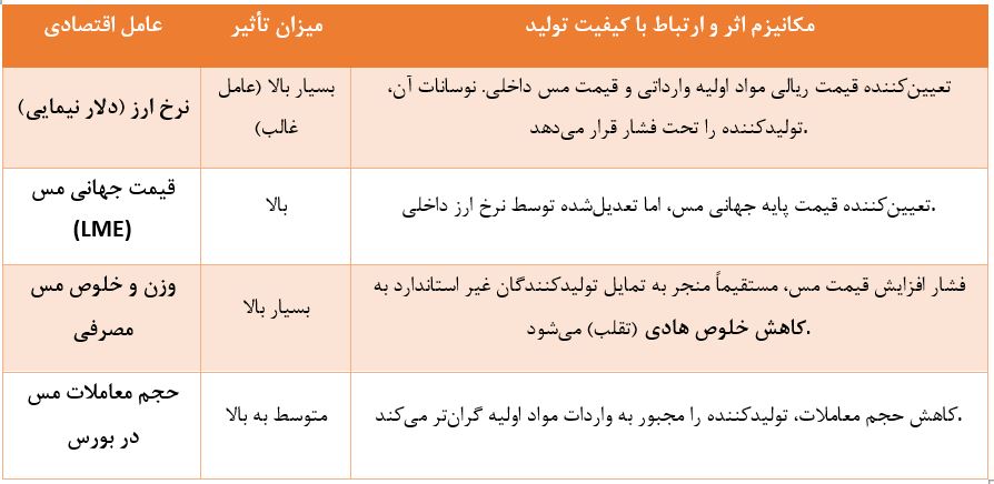 قیمت نهایی مفتول مسی در ایران، که ماده اولیه صنعت سیم و کابل است، از معاملات بورس کالا تبعیت میکند.۸ این قیمت تابعی از دو عامل کلان جهانی و داخلی است: