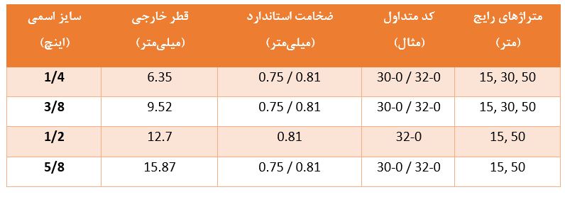 در بازار ایران و در میان برندهای مطرحی مانند باهنر، مهر اصل، بابک و قائم، ضخامتهای رایج لوله کلاف (برای مثال در سایز ۱/۴ اینچ تا ۵/۸ اینچ) اغلب با کدهای داخلی و معادلهای میلیمتری مشخص میشوند: