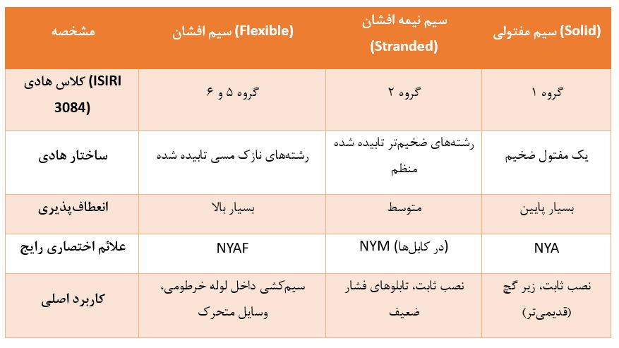 جهت درک بهتر تفاوتهای اساسی بین انواع هادیها بر اساس ساختار مکانیکی و استاندارد ISIRI 3084، جدول مقایسه فنی زیر ارائه شده است: