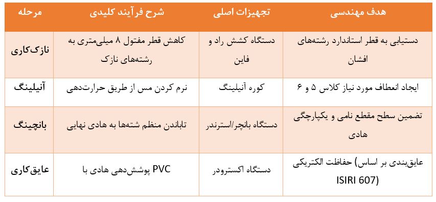 تولید سیم افشان یک فرآیند مهندسی دقیق و چند مرحلهای است که هر گام آن مستقیماً بر کیفیت نهایی و انطباق محصول با الزامات استاندارد ۳۰۸۴ تأثیر میگذارد. هرگونه کوتاهی در هر یک از این مراحل، به ویژه در میزان خلوص مس یا فرآیند حرارتی، میتواند منجر به تولید سیمی غیراستاندارد و خطرناک شود.