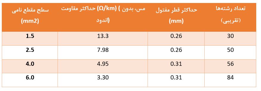 - تعداد رشتهها: تعداد رشتههای سیم نباید از مقادیر حداقل مشخص شده در جداول استاندارد ملی ایران به شماره ۳۰۸۴ کمتر باشد. به عنوان مثال، برای سیمهای پرکاربرد ۱.۵ میلیمتر مربع، حدود ۳۰ رشته و برای ۲.۵ میلیمتر مربع، حدود ۵۰ رشته سیم مسی لازم است.