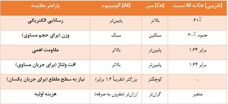 جدول ۱: مقایسه پارامترهای فنی کلیدی: آلومینیوم در برابر مس