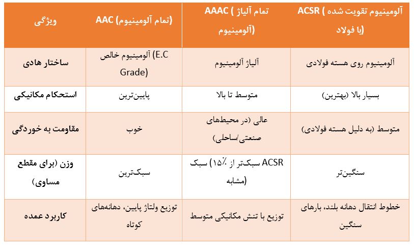جدول ۲: مقایسه فنی انواع هادیهای لخت آلومینیومی
