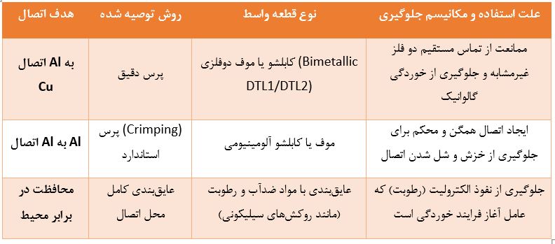جدول ۳: راهنمای عملی اتصال کابلهای آلومینیومی (پیشگیری از خوردگی گالوانیک)