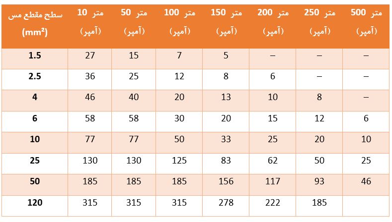 جدول مرجع جریان مجاز سیم مسی (بر اساس طول و سطح مقطع)